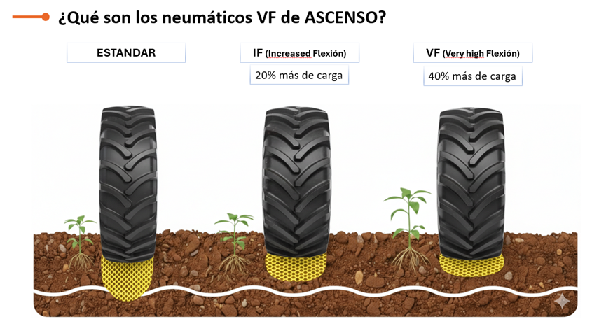 Las nuevas tecnologías en neumáticos agrícolas, como los neumáticos VF (Very High Flexion), buscan precisamente minimizar este problema. Gracias a su mayor flexibilidad, permiten trabajar con menor presión y distribuir mejor el peso del tractor o apero, aumentando la huella sobre el terreno. Esto reduce la compactación, mejora la tracción, protege la estructura del suelo y contribuye a un rendimiento agrícola más sostenible y eficiente.