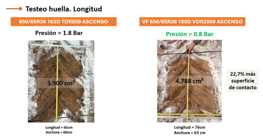 El neumático estándar a 1.8 bar de presión ofrece una huella de 3.900 cm cuadrados, frente a los 4.788 centímetros cuadrados que da el neumático VF a 0.8 bar de presión. La huella del neumático VF ofrece un 22.7% más de superficie de contacto.