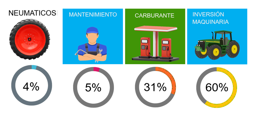 Aunque los neumáticos sólo representen el 4% del gasto directo, son el factor técnico que tiene el "mando a distancia" sobre los dos costes más grandes: el carburante (31%) y la amortización de la maquinaria (60%).