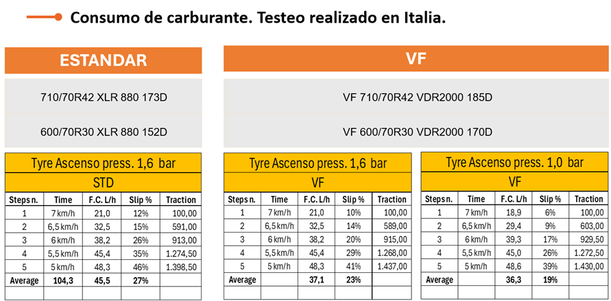 Se aportan datos de una prueba de consumo de carburante realizada por Provana Group, una consultora y sociedad de cartera (holding) italiana con sede en Izano (Cremona), especializada en el sector agrícola, específicamente en la ingeniería y análisis técnico de neumáticos.